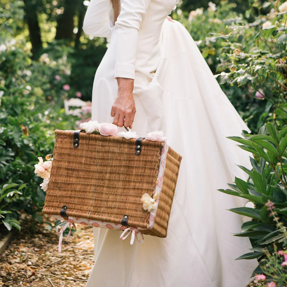 This beautiful woven rattan picnic basket is lined with a 100% cotton hand block printed liner in the Carnation Blush pattern.Â