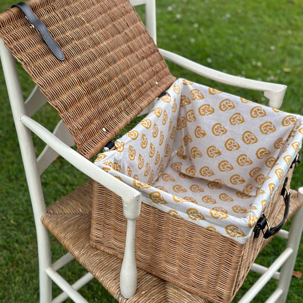 This beautiful wovenĀ rattan picnic basket is lined with a 100% cotton hand block printed liner in the CarnationĀ Golden pattern.Ā