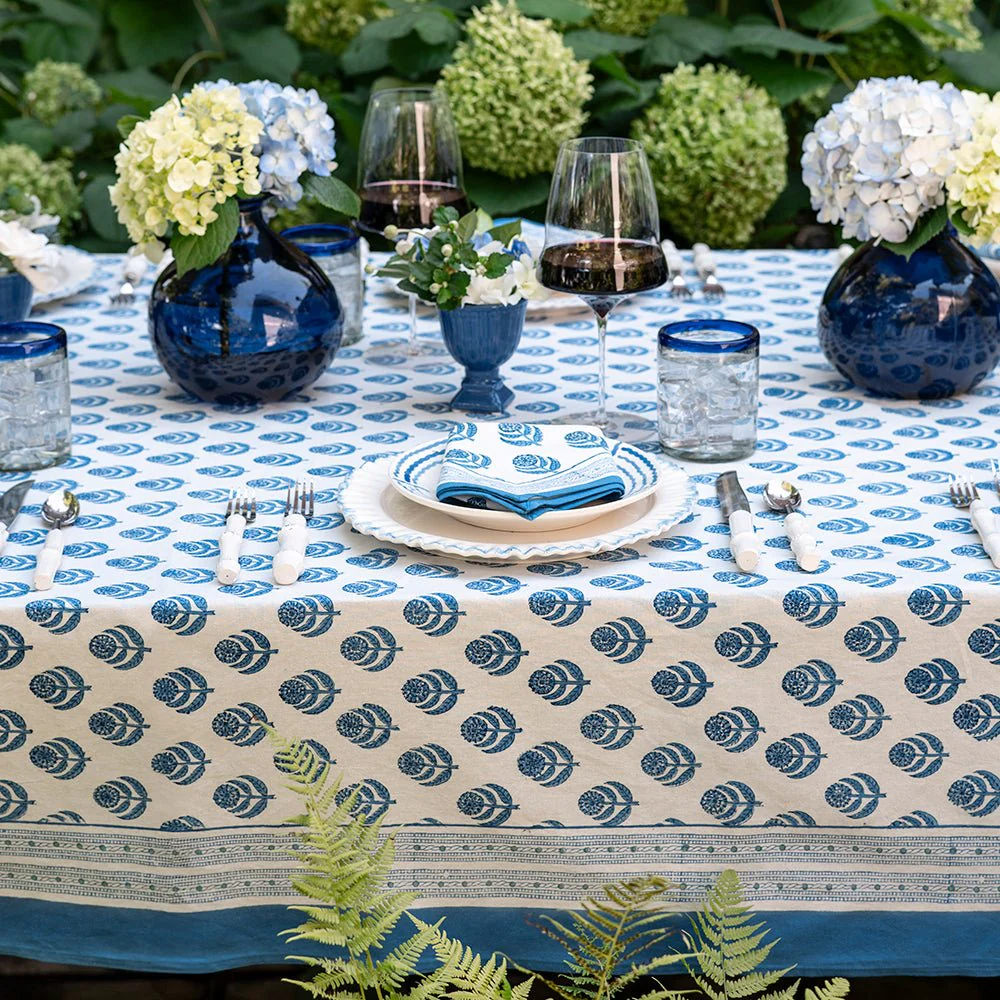 Relaxed, rhythmic, and effortlessly charming, our Pinot Tablecloth brings a collected, vineyard-inspired feel to the table. Stylized motifs and curling leaves repeat across a soft ivory ground in layered blue tones — graphic but gentle, playful but grounded.